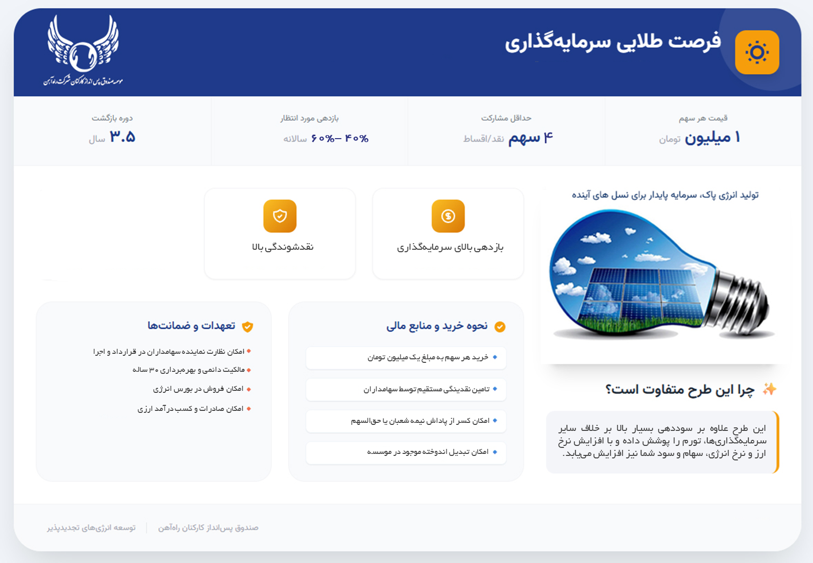 - از منظر مسئولیت اجتماعی، حضور در این طرح به معنای سهیم بودن در کاهش وابستگی به سوختهای فسیلی است. همچنین این سرمایهگذاری گامی مؤثر در کاهش ناترازی انرژی در کشور و ایجاد آیندهای پاکتر و سالمتر برای نسلهای آینده محسوب میشود.