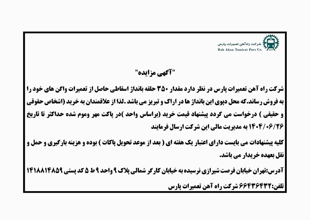 آگهی مزایده شرکت راهآهن تعمیرات پارس